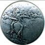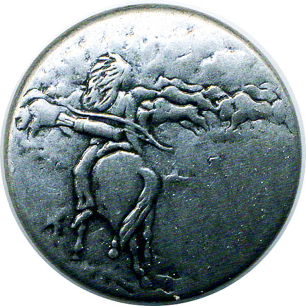 Two more Indian-theme buttons. The one on the left is a two-piece construction, possibly aluminum. It shows a warrior riding his pony out on a buffalo hunt. The right button is sterling silver and shows a teepee. |