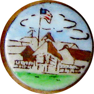 This is a ceramic button of Fort Dearborn in Illinois, which was located at what is now the intersection of Wacker Drive and Michigan Avenue in the Loop area of Chicago at the foot of the Magnificent Mile. Part of the fort outline is marked by plaques and a line embedded in the sidewalk in the area. In 1933, at the Century of Progress Exhibition, a detailed replica of Fort Dearborn was erected as a fair exhibit. As part of the celebration a United States postage stamp was issued. Possibly this button was made at that time as a souvenir. |