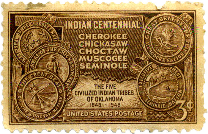 This 3˘ stamp from 1948 celebrates some Oklahoma history, honoring the Five Civilized Tribes. |