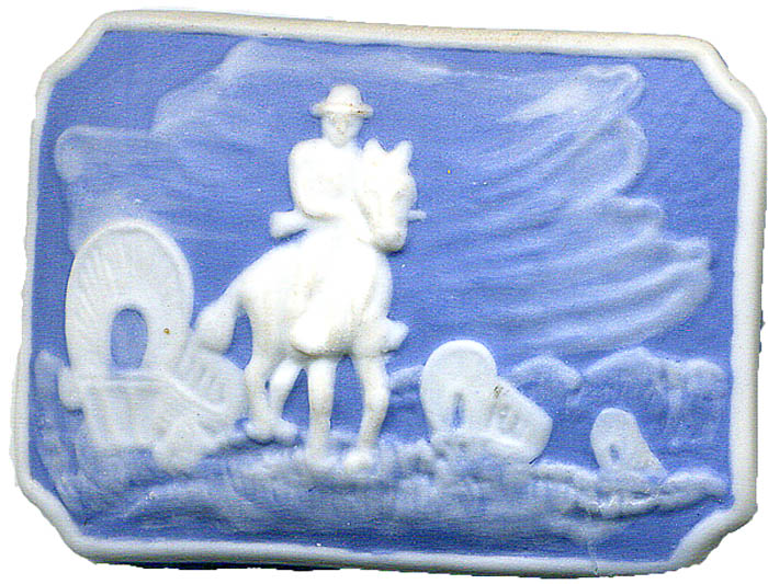 A large jasperware button, which is a type of porcelain, backed marked “S R ‘99” (Stella Rzanski) with a scene from the westward migration of early American settlers. |