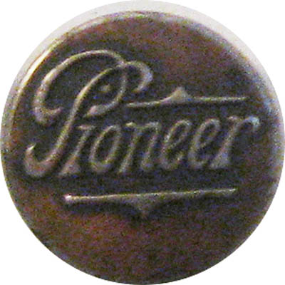 A metal wobble shank work clothes button advertising the Pioneer brand of rugged work clothes. These buttons had their heyday at the turn of the 20th century. |