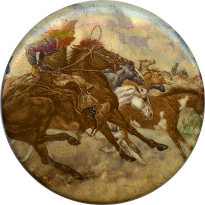 Two buttons made of plastic with transfers. One can almost hear the galloping hooves, shouting of cowboys and Indians, and neighing of wild mustangs. |
