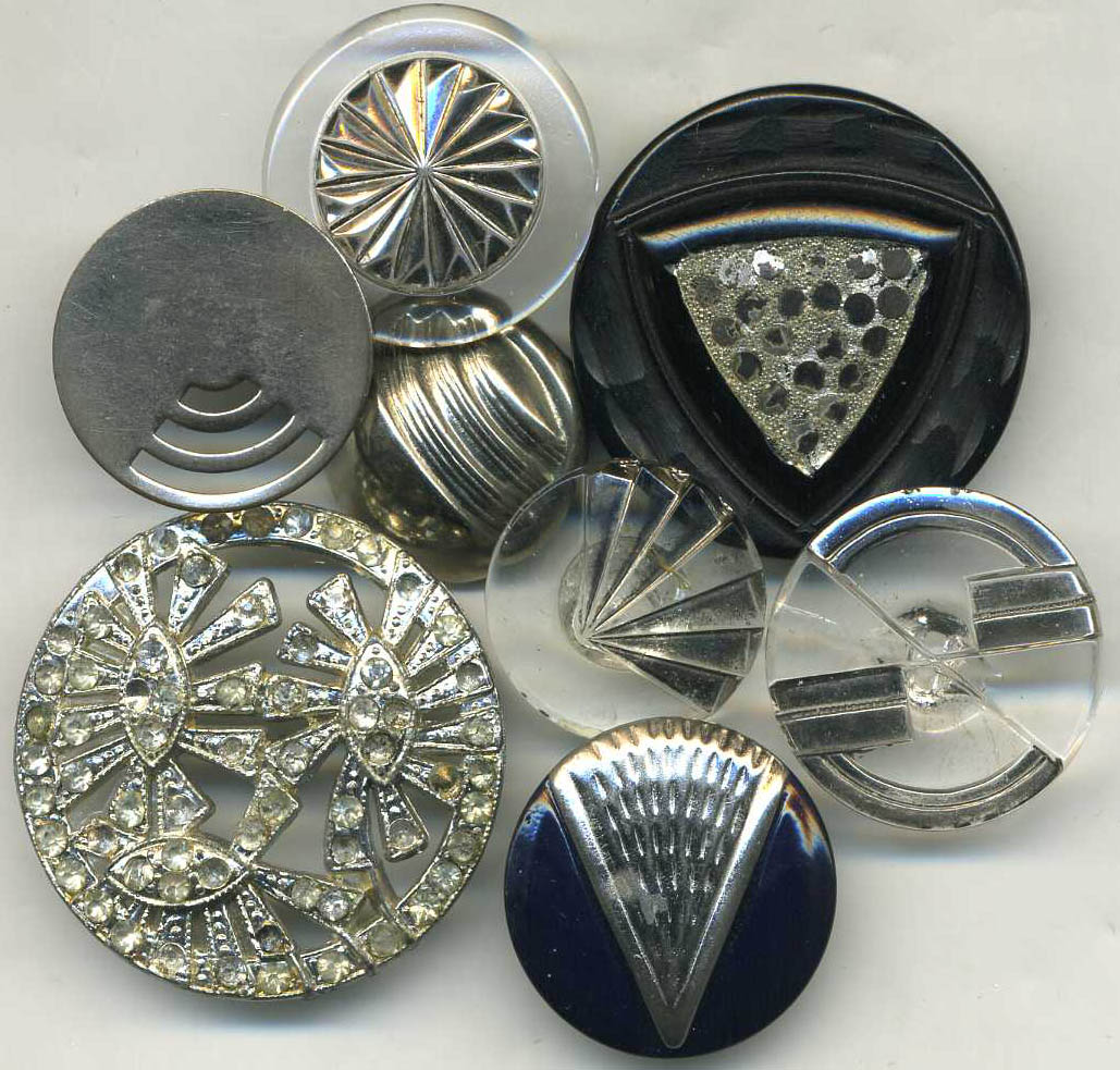 Deco and is prevalent on many American skyscrapers. It is identified by the prevalence of zigzags, chevrons, spirals, fronds, and half-circles. The second phase was more popular during the 1930s . It was transitional, incorporating elements of the zigzag style, as well as the later, more streamlined style. The third phase, also popular during the 1930s, features streamlined, aerodynamic shapes symbolizing industry and mechanization. Most Art Deco buttons are easily identified by their streamlined designs, which is one of the clearest hallmarks of Art Deco. This streamlined look was seen as symbolizing America's newfound appreciation and enthusiasm for industrialization and mass production that became popular in the 1920s and 30s. Shapes are simple, bold, geometric, with more defined vertical, parallel and horizontal lines, as well as repetition of patterns and geometric shapes. |